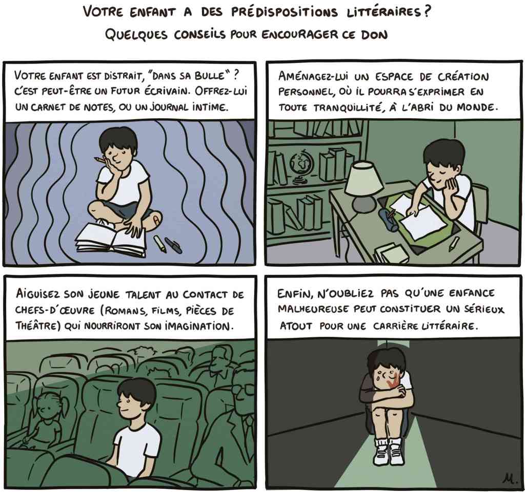 On trouve quelques livres avec des conseils pour devenir écrivain. Bien entendu, c’est uniquement pour faire de l’humour et de la dérision. On pourrait croire au vue du nombre de séminaire avec des écrivains célèbres, à un prix assez important, qu’il y a des trucs pour savoir bien écrire et/ou trouver les sujets qui font vendre. M. la Mine décide de proposer des conseils au vue de son succès jamais démenti. Bien entendu, le but est de faire de la dérision et de s’amuser avec des imaginaires comme les poètes maudits. Tout est structuré dans quatre chapitres : 1. Se lancer, 2. S’accrocher, 3. Persévérer, 4. Ne pas se décourager (même si c’est voué à l’échec). En un gag, il s’amuse à montrer le désespoir des écrivaillons cherchant l’inspiration, se mettant dans des situations de précarité ou de danger.