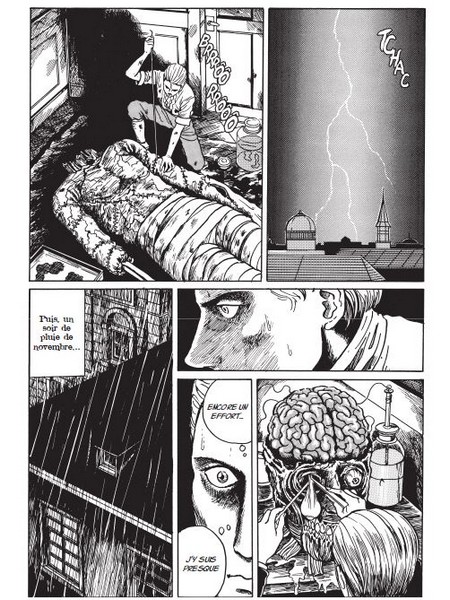 Un des maîtres de l’horreur japonais donne une nouvelle dynamique au roman de Mary Shelley. On retrouve ce cher Victor Frankenstein totalement épuisé sur la banquise. Il était à la dérive sur la banquise. C’est Robert Walton qui lui sauve la vie. Lui aussi est un homme avec des rêves de grandeur. Mais cette rencontre va tout changer. Est-ce que son narcissisme doit coûter la vie des matelots? Pour le créateur de monstre, il est trop tard. Toute sa famille et ses amis ont été assassinés. Donc aller trop loin dans la folie, il sait ce que c’est. Le mangaka nous propose un flash back où l’on voit la naissance de ce géant composé de cadavres. Les gens le haïssent car il est laid et lui jettent des pierres. La différence créé le rejet et l’injustice sociale. Un cercle vicieux qui laisse toute sa place à la méchanceté.
