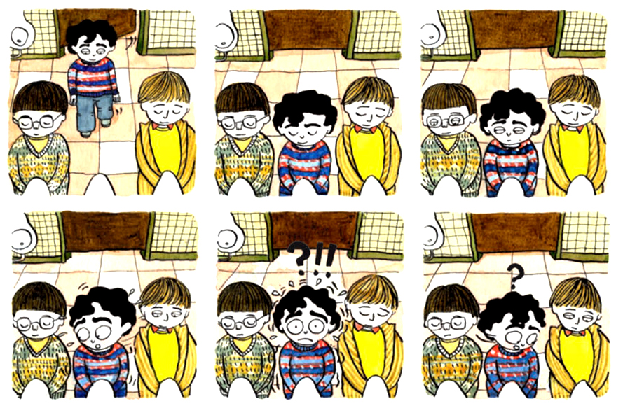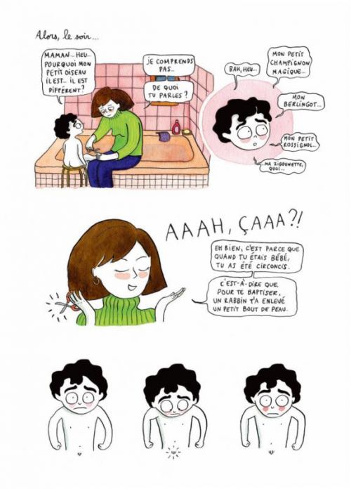 Il existe peu de bd grand public qui aborde la religion juive hors Riad Sattouf. Elle est abordée à travers le regard d’un petit garçon avec des parents divorcés. D’un côté, on lui dit qu’il était juif et de l’autre on lui dit que cela n’a pas d’importance. Quand on est petit on veut faire plaisir. Et puis la religion est aussi lié à des rites culinaires où l’on peut manger de bonnes choses et entendre des histoires incroyables. Puis en grandissant, dire que l’on est juif a un autre impact et Benjamin commence à se poser des questions. Qu’est-ce que cela veut dire concrètement? D’autres éléments importants viennent ponctuer son quotidien de garçonnet comme les filles. Quel dilemme ce zizi circoncis. Elles font tourner les têtes et bouleversent les émotions. Au final, il prend un chemin où la foi n’a pas sa place. L’art avant tout et écouter son coeur aussi.