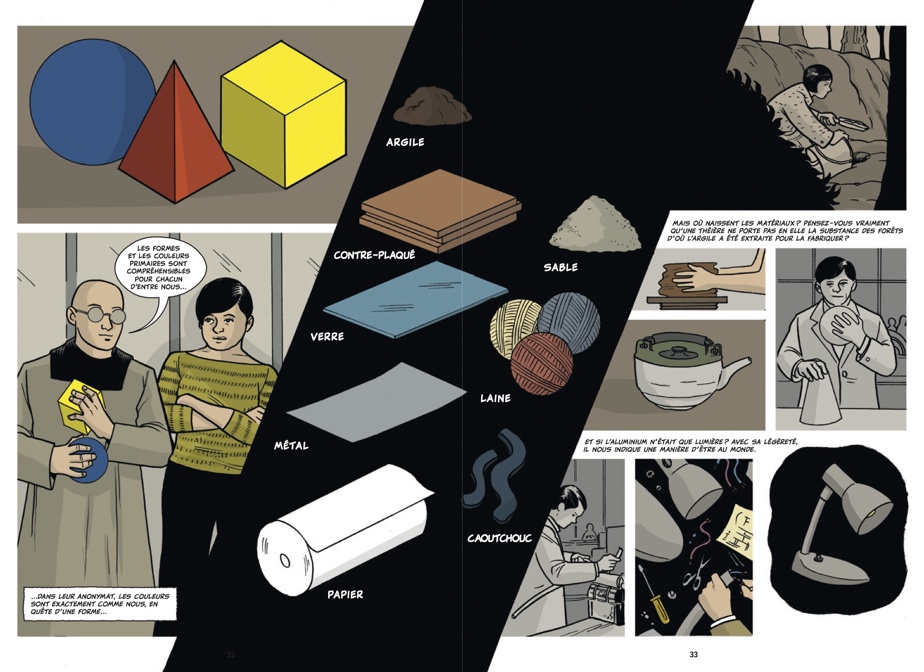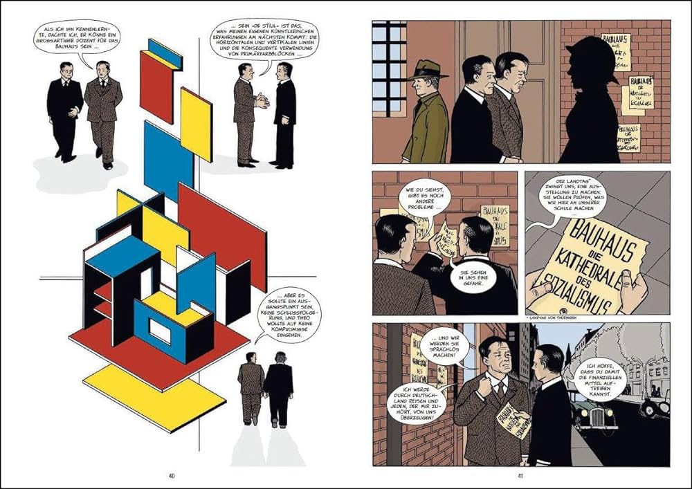 Ce roman graphique, composé de trois chapitres, raconte son histoire de sa création à Weimar par Gropius en 1919 à la fin de la Première Guerre mondiale, jusqu’à son déménagement en 1925 à Dessau et sa fermeture par les nazis à Berlin en 1933.