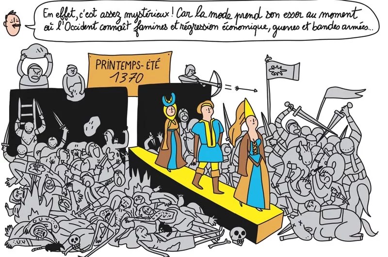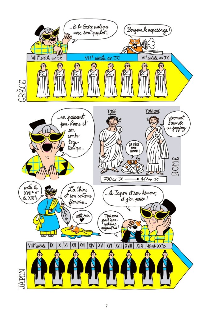 Les bd qui évoquent la mode ne sont pas légions. On en trouve qui parlent de créateurs. Là en plus, on a le droit à la collection Octopus, assez réputé pour la qualité du contenu. Le récit est fait à travers deux personnages : Odette, une mamie au sacrée caractère, couturière de formation et Jean-Paul, le hamster, anthropologue de la mode. On commence par le début. De l’Egypte ancienne à la Grèce antique en passant par Rome, les vêtements sont unisexes. La mode paraît au 14e siècle, à la fin du Moyen Age. « […] la mode prend son essor au moment où l’Occident connaît famines et régression économiques, guerres et bandes armées. Et la crise du système féodal, ni la montée des classes marchandes, ni même la volonté des nobles de se distinguer de nouveaux riches me permettent d’expliquer totalement ce phénomène… En fait, l’apparition de la mode révélerait un changement de rapport au monde, un changement de mentalité. Le monde serait une initiative esthétique plutôt qu’une réponse économique. » (p. 9).