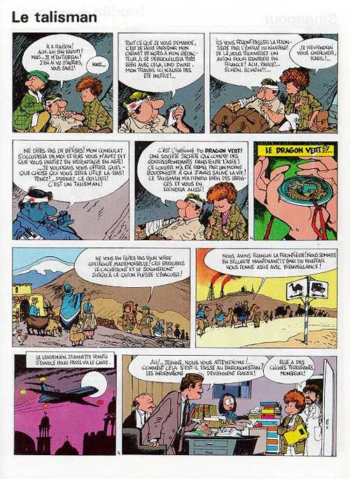 Pour l’aventure, en elle-même, comme d’habitude, c’est très capillotractée. Jeannette a toujours une chance incroyable et elle s’en sort toujours grâce à des hommes. Et là, un journaliste allemand blessé offre à la photoreporter un médaillon avec un dragon vert pour l’aider pour son séjour en Asie. Cela n’a aucun sens qui lui offre un tel objet sans raison. Et à chaque fois qu’elle est dans une galère, elle sort l’objet et là voilà qu’on accède à ses requêtes. C’est trop facile et cela souligne qu’elle n’arrive à s’en sortir grâce à son ingéniosité et son intelligence mais au hasard. Chose étrange, on la voit prendre des photos cependant on ne voit jamais le résultat. Elle donne des scoops. Contribue t’elle a sensibiliser la société à ce conflit faisant beaucoup de cadavres? On en vient à se dire si elle ne vaut pas mieux qu’un paparazzi qui travaille que pour l’image choc, qu’importe ce qu’il montre. Elle ne semble pas vraiment avoir d’éthique et encore moins d’émotion. Une femme meure devant elle et lui confie son enfant ça lui fait pareil qu’une chose ordinaire. On ne s’attache pas vraiment à elle. Elle donne à suivre une aventure où elle devait retrouver le fils d’un homme influent qui pourrait lui rendre service à l’avenir. Ce qui se passe autour n’a pas trop d’importance ni les autochtones qui se mouillent pour les aider. On finit la bd de 48 pages avec un sentiment d’inabouti. Tout va trop vite et trop est invraisemblable. C’est dommage de ne pas profiter d’avoir un personnage féminin pour ne pas faire autre chose qu’une jolie nana chanceuse avec un corps que l’on sexualise trop souvent.