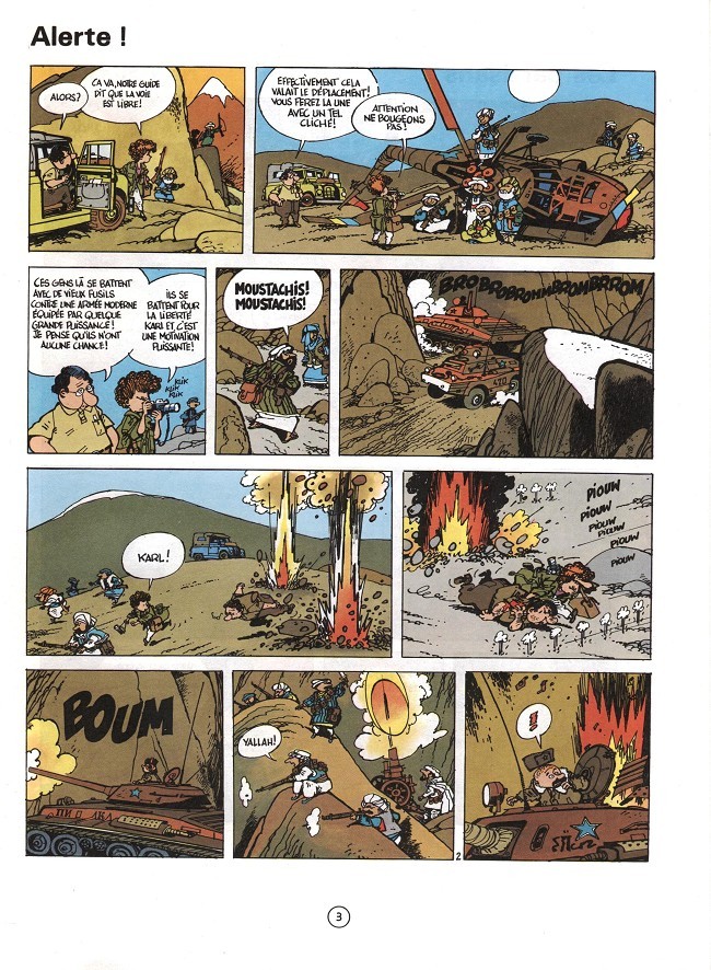 Qu’importe où il faut aller, elle y va toujours avec le même enthousiasme. Elle est déjà allée dans des zones de guerres et être une femme ne pose pas de souci. Marc Wasterlain prend un parti politique car il évoque la guerre au Cambodge (le Khompôt dans l’histoire) qui occupé par les Vietnamiens (les Tongsamiens). Un vague pseudo permet d’identifier le dictateur meurtrier Pol Pot. Il est montré juste comme un méchant ordinaire comme d’autres séries de l’époque telle « Spirou et Fantasio ». On dénonce gentiment. Il ne faut pas oublier que l’ouvrage s’adresse à des enfants et qu’il ne faut pas les traumatiser. Donc des gens meurent sans jamais y avoir de trace de sang. On évoque des camps de redressement sans les montrer. Par contre, on voit des hommes armés que l’on peut acheter facilement. Ils ne combattent pas pour des idées. Le bédéaste montre des mineurs qui prennent les armes et qui n’ont pas trouver d’alternative. Par contre, on doute vraiment que leur rêve soit d’aller à l’école pour apprendre des choses. Le personnage de Yaho est très présent et on le retrouvera par la suite.
