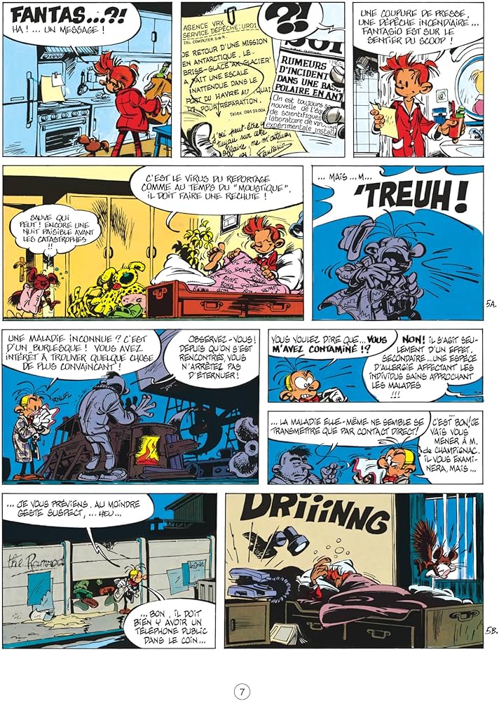 On rentre tout de suite dans le sujet. Il faut dire qu’en 46 pages, il est nécessaire d’aller à l’essentiel. Fantasio tente d’avoir un scandale rapidement. Pour la peine, il porte une veste qui doit le rendre incognito. Du moins, c’est douteux car elle est grise avec des motifs réalistes mauves. Le voilà embarqué dans une aventure dangereuse qui risque de décimer la plupart des humains de la planète. Aider de Spirou, il sauve un de leur ancien ennemi, Helena. Il est vert preuve qu’il est contaminé. Celui qui a la clé de tout est forcément le comte de Champignac. Le mycologue sait tout faire et comprend tout. Donc trouver l’antidote est très aisé. Pas besoin de nombreuses expérimentations. Il suffit d’aller sur place en Antarctique et d’ajouter une molécule pour avoir le produit idéal. Bien entendu, sur place les choses ne se passent pas comme prévu. Une bande de méchants leur mettent des bâtons dans les roues. Grâce à des interventions d’autres personnes, le trio arrivent à son objectif.