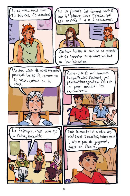 Quand on regarde la couverture, on est face à une jeune femme en colère. Le titre confirme cette sensation de révolte. On rentre dans l’histoire avec la confirmation de cet énervement tumultueux. Sur la première page, on voit un verre de limonade en gros plan avec plusieurs phrases : « Tu me saoules! Maintenant tu te casses tu leur fous la paix! Casse-toi! » (p. 7). Un mec qui a dépassé la trentaine tente de draguer très lourdement des mineurs assises en terrasse. Une mise en bouche sur l’importance et la liberté dont jouisse les pervers vicieux dans la société. Clémence est en rage et elle cultive cette émotion. Quand elle décide de rejoindre un groupe de parole qui réunit des femmes ayant subi des violences sexuelles, son rapport au monde change. 15 semaines avec 15 séances permettent de mettre des mots sur des souffrances, de discuter avec des personnes bienveillantes. Le viol est un abus sur un corps et aussi sur un esprit. Se reconstruire demande du temps. Et voir le nom de son agresseur ou le voir demande du courage pour ne pas s’effondrer. Le témoignage fictif de Clémence touche indéniablement.