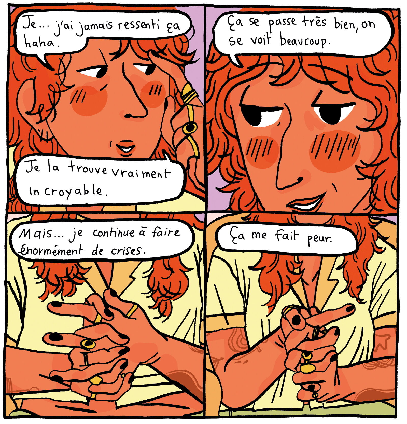 Mirion Malle est fidèle à son style direct et provocateur. Il est hors de question d’éviter des sujets tabous car cela va déranger certaines personnes. Les mots ont le droit d’avoir des mots. Comme à son habitude, elle valorise l’importance de l’amitié. Des amies toujours là pour écouter, réconforter et aussi rire. Sans oublier l’amour, celui qui anime et qui fait peur. Ouvrir son coeur est toujours une prise de risque. Par contre, la façon de parler désarçonne. On assiste à un mélange de français et d’anglais ainsi que des expressions pas toujours compréhensible. Est-ce propre au parler canadien? au parler jeun’s branchés? un mélange des deux? Pour le graphisme, on reconnaît aussi la pâte de la bédéaste avec son dessin fait main levé et ces couleurs chaudes. Un choix dans l’air du temps qui botte le cul aux classiques.