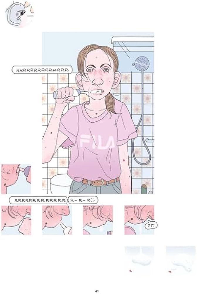 Quand on regarde la couverture, on ressent un malaise. Est-ce le regard inquiet de l’adolescente ou les masques bleus pour se protéger d’un virus ou encore le champignon atomique? Que de choix. Au final, c’est déjà le rendu graphique de Miguel Vila qui créé un univers tendu et assez malsain. Tous les personnages ne cherchent qu’à nuire aux autres, être cruel, toujours dans le jugement. Le graphisme fait penser à celui de Robert Crumb avec des gens un peu moins hideux et des teintes plus douces. Mais cela demande de faire un effort pour ne pas fermer l’ouvrage pour ne pas y revenir du tout. La mise est très originale et fait penser à des bd modernes. Il faut s’accrocher.