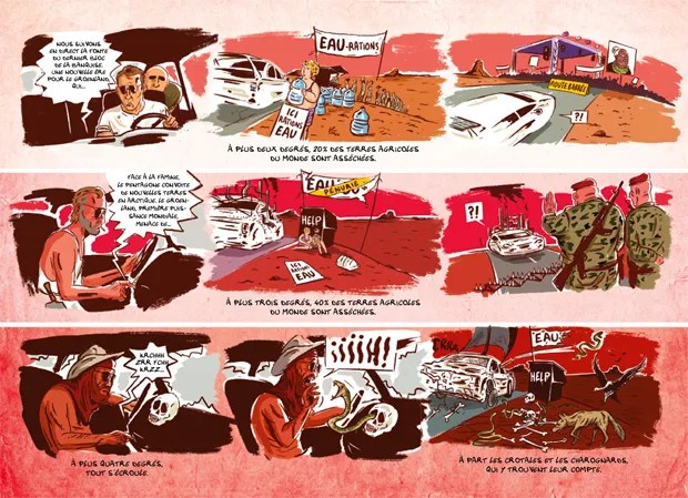 Ulysse Gry est un bédéaste très audacieux. Il ose aborder la question du réchauffement climatique de façon originale. Déjà c’est assez peu traité et là l’album n’est consacré qu’à ça. Il a choisit de proposer une forme horizontale ce qui est très atypique. Quand on ouvre la bd, nous voilà avec trois choix comme dans un restaurant. Vous pouvez suivre trois scénarios autour d’un personnage. Le monde avec 2, 3 ou 4° de plus et le changement n’est pas négligeable. Ce n’est pas comme si on passait de 14 à 15°, les choses sont beaucoup plus complexes. Les choses reposent sur la capacité de l’humain à pouvoir respirer, manger et vivre. Tout cela devient compliqué voir très difficile. Car plus il est difficile de se nourrir et boire et plus la violence prend de la place. On organise la gestion du vivant avec plus de rigorisme et plus d’intolérance. La recherche de criminel et la quête d’organes deviennent des moyens de gagner de l’argent. On sent très bien les nuances avec les degrés de plus qui n’appellent pas au rêve. C’est dommage que l’on ne trouve pas un petit dossier pédagogique en fin d’ouvrage.