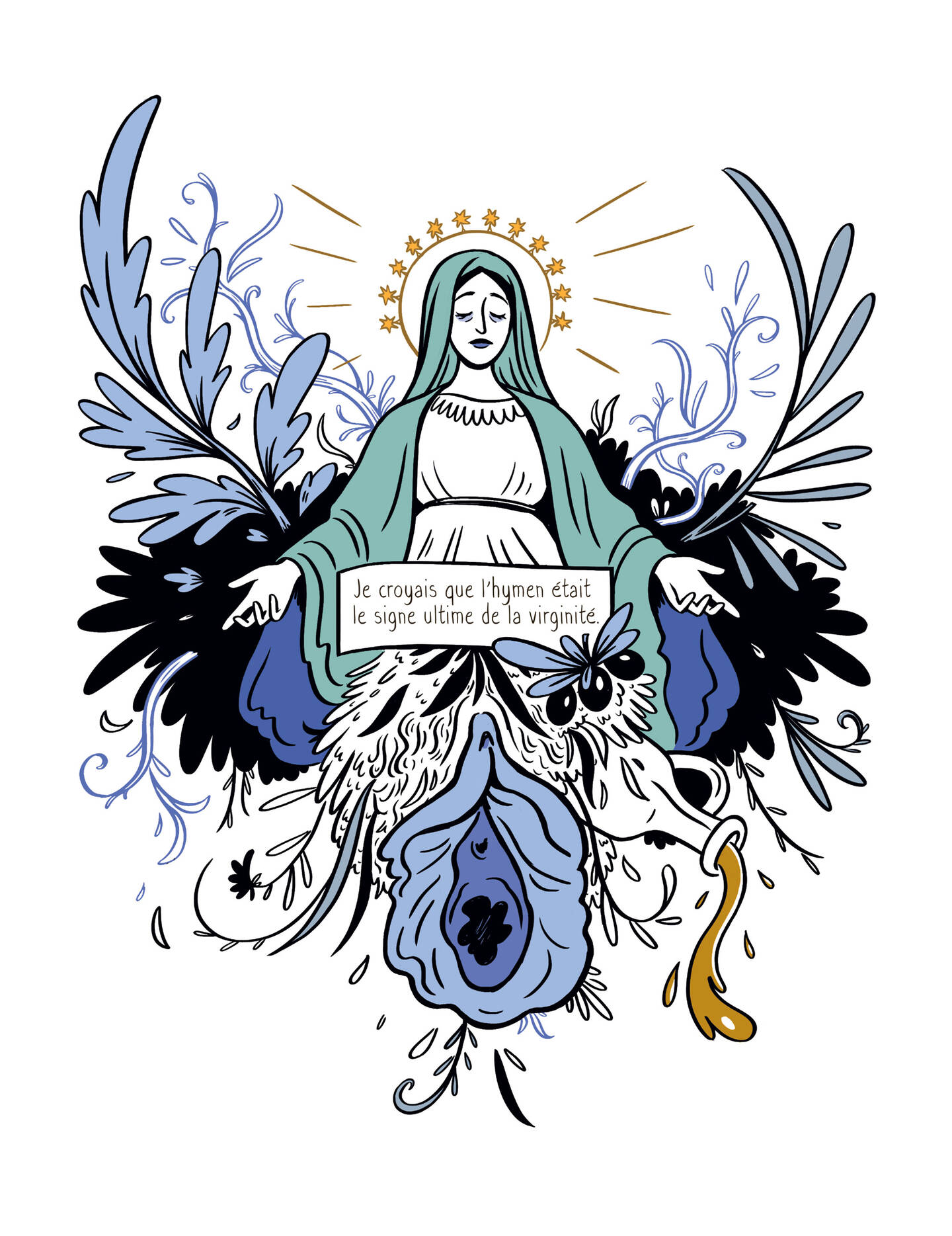 La bande dessinée débute avec le témoigne de la scénariste, Elise Thiébaut, sur son imaginaire autour de la virginité. Depuis qu’elle est enfant, ce mot faisait partie de son monde sans pour autant comprendre ce que cela signifiait vraiment. « Jusqu’à un âge avancé, j’ai cru que les vierges étaient des personnages qui n’avaient jamais eu de relations sexuelles, ou des terres sur lesquelles la main de l’homme n’avait jamais mis le pied. Que la Vierge, elle, ne l’avait probablement pas été avant de donner naissance au fils de Dieu. Et que l’huile d’olive première pression à froid qualifiée de « vierge » était bonne pour la santé » (p. 6). En menant l’enquête, elle découvre que les choses ne sont pas aussi simples. « J’ai appris que les déesses vierges n’étaient pas forcément chastes, et que ce mot désignait plutôt des femmes célibataires ou sans enfant, parfois même veuves ou ménopausées » (p. 7). Donc on pourrait simplement résumer qu’une vierge est une femme sans homme à ces côtés. C’était mal vu de ne pas être marié. Dans les années 70, le féminisme émerge pour changer la donne. « (…) comme le disait un slogan des débuts du MLF : Une femme sans homme, c’est comme un poisson sans bicyclette » (p. 9). Cette expression peut étonner. Irina Dunn, activiste et écrivaine, en est la créatrice et veut dire que pour être une femme, il n’est pas plus nécessaire d’avoir un homme que Dieu dans sa vie.