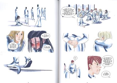 Petit point négatif, pour pinailler, il aurait été intéressant de savoir comment ces femmes ont entendu parlé de cette atelier d’escrime et qui les a inscrite. Est-ce des psy? des associations d’aides aux femmes victimes de violence? N’est-ce pas très difficile de s’inscrire pour faire face à sa souffrance? Avoir aussi cette aspect aurait permis de porter un regard avec encore plus d’empathie. La mise en couleur avec l’aquarelle favorise cette approche touchante qui ne peut nous laisser insensible.