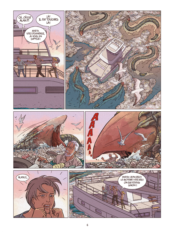 L’enthousiasme n’est pas au rendez-vous. Le dessin assez réaliste à quelque chose de dérangeant. Tout semble faux. On ne s’attache à personne et le récit est capillotracté. Bien que l’on apprécie les références à l’écologie. Les boules étranges qui flottent à la surface de la mer sont des crottes de vers. Ils mangent les déchets plastiques. « En réalité, ces vers font un travail utile : ils nettoient la mer! » (p. 9). Par contre, il est dommage de toujours pas échapper aux clichés sexistes qui perdurent. Pourquoi faut-il insister sur le fait que Fleur soit vierge? Et est-ce utile de la voir nue et à moitié nue? Pourquoi faut-il stigmatiser les personnes grosses comme étant méchante? « Hé! La grosse! » (p. 12). La femme, objet de fantasme toujours présente avec son lot de gros vicieux pervers. Il faudrait changer un peu les représentations si on veut une société plus équitable et juste.