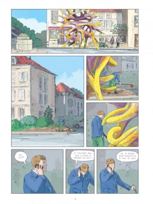 Quand on regarde la couverture, impossible de ne pas être intrigué. Que fait le jeune homme dans ce monde qui mélange zone de couleurs avec des objets? Il faut se plonger dans le récit pour avoir des réponses. Dès que l’on commence, on nous impose une lenteur. On rencontre Orsay qui n’a pas une vie très palpitante. Il s’occupe des espaces verts de la ville et de sa mère malade. Cela lui suffit pour l’instant. Un jour, le voilà en contact avec un toute et ses bras se sont transformés. Pour retrouver un semblant de normalité, il monte à Paris pour trouver un médecin. A partir de là, tout part en vrille. Le jeune garçon tombe amoureux d’une jeune rebelle. Et surtout il rencontre des personnes comme lui qui ont fusionné avec un toute. Sauf qu’eux pensent le monde autrement et n’hésitent pas à tuer sans culpabilité. La police tire en plein coeur de l’adolescente. Les deux mi-humain et mi-toute usent de leur nouveau talent pour lui sauver la vie. Orsay et Melek vivent une expérience étrange et intense.