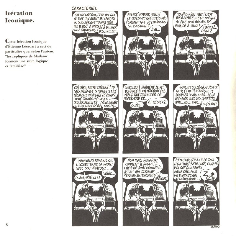 Il y a le fait de reproduire une image plusieurs fois, presque de façon identique. « L’application de Jean-Christophe Menu (Scénario) et Killoffer (Dessin) est simple : traiter dans l’ordre chaque point du Règlement Intérieur de la BPI, chacun en deux cases, et le tout basé sur l’Itération, notamment de la seconde case. » (p. 121). Et il y aussi un panneau avec des interdictions qui se nomme « Extrapolation Textuelle et Graphique ». Il se présente : « Pour cette dernière Application, Lewis Trondheim a réalisé, à la façon de panneaux, quinze pictogrammes qui correspondaient chacun à une interdiction du Règlement de la BPI. Puis Anne Baraou a puisé dans ces images pour en tirer trois récits. » (p. 126). Les pictogrammes sont assez lisibles et compréhensibles par tous. Ainsi si on veut faire un atelier en entreprise ou à l’école, on peut demander aux participants d’en créer, d’en dérouter ou de transformer l’existant. Toutes ces propositions sont très intéressantes et nous inciter à penser autrement les choses.