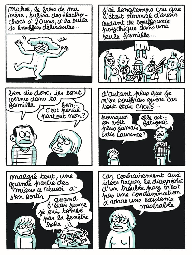 Lisa Mandel invite le lecteur a rencontré plusieurs personnes réelles qui ont différents troubles psychiques. Elle souligne très bien l’errance médicale, leurs diagnostics, leurs parcours de vie et ce qui a été évoqué précédemment. On comprend très bien les troubles qui changent le rapport au monde et aux autres. Les personnes viennent à identifier que ce qui se passent n’est pas normal et qu’il faut trouver des réponses. Le parcours de santé n’est pas du tout linéaire. Puis il y a la question du rétablissement et non la guérison. Elle est soumise à des aléas pouvant être aussi bien de courtes ou longues durées. Cela n’empêche pas de pouvoir vivre sa vie. Les médecins doivent aussi ne plus confondre maladie et individu. « – De toute façon, la maladie, ça fait partie de leur personnalité. – C’est pas possible d’entendre des conneries pareilles! La maladie, ça n’a jamais fait partie de la personnalité de quelqu’un! La maladie, c’est la maladie, point barre! » (p. 89). Un fait qui est nécessaire d’intégré.