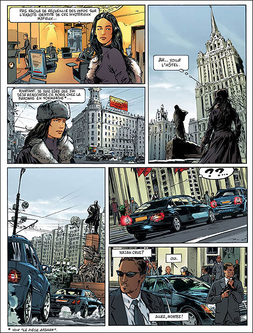 La sublime Najah est envoyé en Russie pour infiltrer un réseau de mafias très bien organisé. Elle fait le boulot comme il faut. Les compétences ne manquent pas ce qui lui permet d’être toujours là au bon endroit. Ecoutes, filatures, surveillance, meurtres, protections, recherche d’infos, maniement des armes, polyglottes… sans oublier son charme auxquels les hommes ne sont pas insensibles. Il n’est pas facile d’avoir des informations dans ce monde de corruption et de malhonnêteté. Son infiltration pour les américains ne se déroule pas vraiment comme prévu. Un homme venu de son passé a dévoilé sa vraie identité. Elle doit fuir et vite car plus d’un voudra sa peau. On termine avec un cliffhanger.