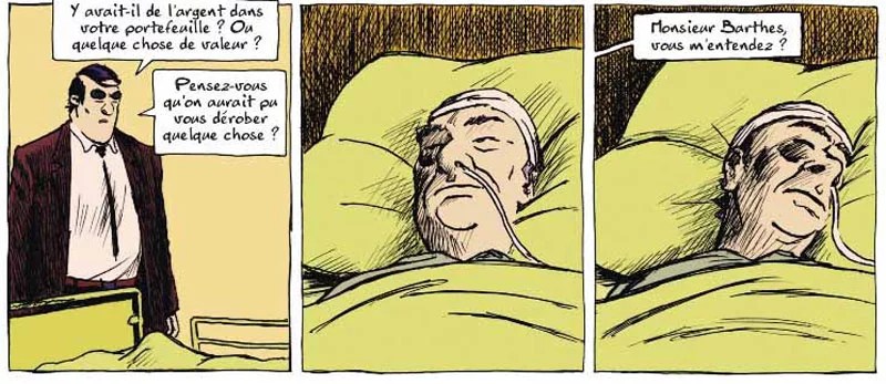 Xavier Bétaucourt a décidé d’adapter en bd le roman de Laurent Binet. Il retranscrit l’enquête un peu particulière autour de l’accident puis du meurtre de Roland Barthes en 1980. Jacques Bayard, commissaire, fait appel à Simon Herzog, jeune sémiologue pour l’aider à mener l’enquête. Il n’arrive à comprendre ces trucs d’intellectuels qui ne servent à rien et auquel il ne comprend pas grand chose. Barthes a permis d’analyser le langage et d’en comprendre les subtilités.