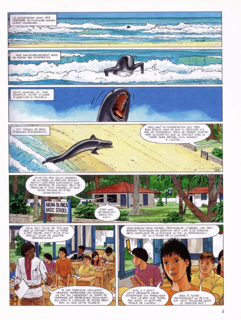 Le cadre est posé avec les terriens dont on n’a plus de nouvelle, la mer où il se produit des choses bizarres, des rebelles qui tentent de comprendre, des gens au pouvoir qui veulent tout contrôler et des adolescents qui veulent retrouver une situation stable. Le bédéaste propose un univers assez riche avec des paysages d’une grande diversité. Les animaux possèdent tous quelque chose d’étrange et de fascinant. Par contre, les mineurs ont l’air beaucoup plus âgés et futés par rapport à leur âge. Et malheureusement, les femmes sont hypersexualisée. La journaliste porte des vêtements très moulants avec un décolleté. On la voit aussi de dos avec un gros focus sur ces fesses. Tout cela n’apporte bien entendu rien à l’histoire. C’est du voyeurisme dégueulasse ordinaire. Heureusement que le corps des mineurs est recouvert de vêtements normaux. Le dessin est assez rigide et trop classique tout comme les couleurs en aplat.