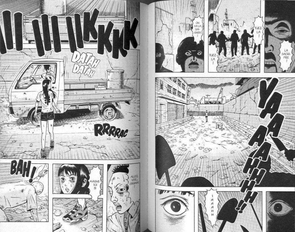 L’évocation d’un monstre est plus récurrente. Un dragon serait-il venu envahir le monde et plus principalement le Japon? Le terme dragon est évoqué et la série se nomme ‘Dragon head ». Que faut-il y voir? Cette image d’un tiers est plutôt de souligner de ce que fait l’Homme face à la peur et à l’incertitude. Minetaro Mochizuki insiste sur le fait que quand il n’y a plus de figure d’autorité, les être humains sont perdus. La majorité choisit de devenir égocentrique, narcissique et de tuer les autres pour avoir l’illusion de maîtriser quelque chose. La solidarité pour faire sens ensemble n’a pas sa place. Car un groupe va collaborer pour tuer les survivants puis se suicider. La violence revient et s’impose comme unique alternative.