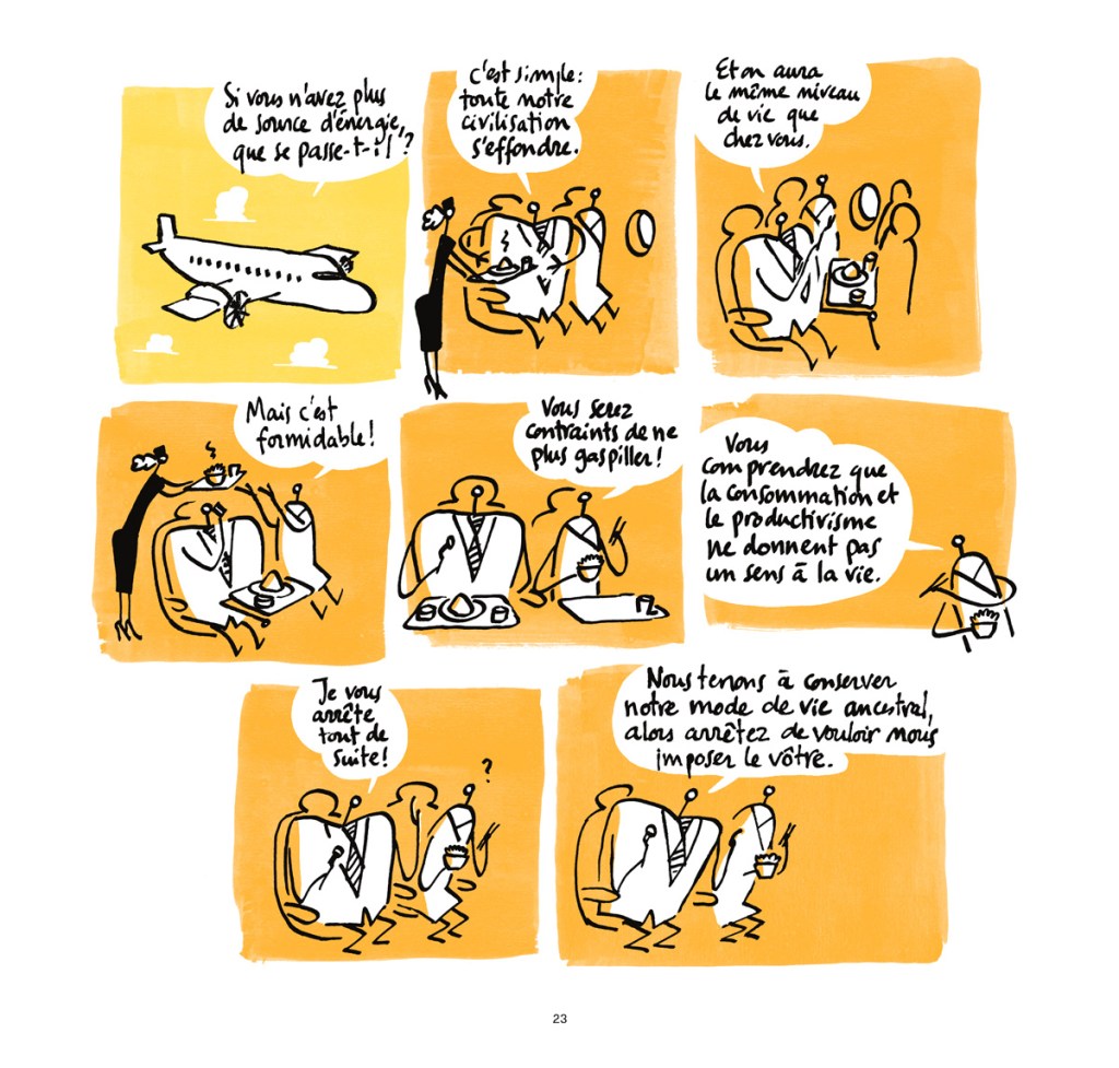 On a une petite leçon d’économie avec en référence Milton Friedman et les Chicago Boys. Comment exploiter les pauvres pour se faire le maximum d’argent rapidement? Après il faut gérer les conséquences de l’exploitation des ressources naturelles. On fait des COP où les Etats et les entreprises viennent pour s’engager mais pas trop. Au final, les changements ne sont pas significatifs et on se congratule. Les religions permettent aussi de maîtriser les gens et que les dirigeants puissent suivre leur vie tranquillement. Donc tout va péter et tout risque de disparaître. A la limite de la destruction, de nouvelles choses émergent. On l’espère. On ne ressort pas indemne de cette aventure qui montr que le monde ne tourne pas rond.