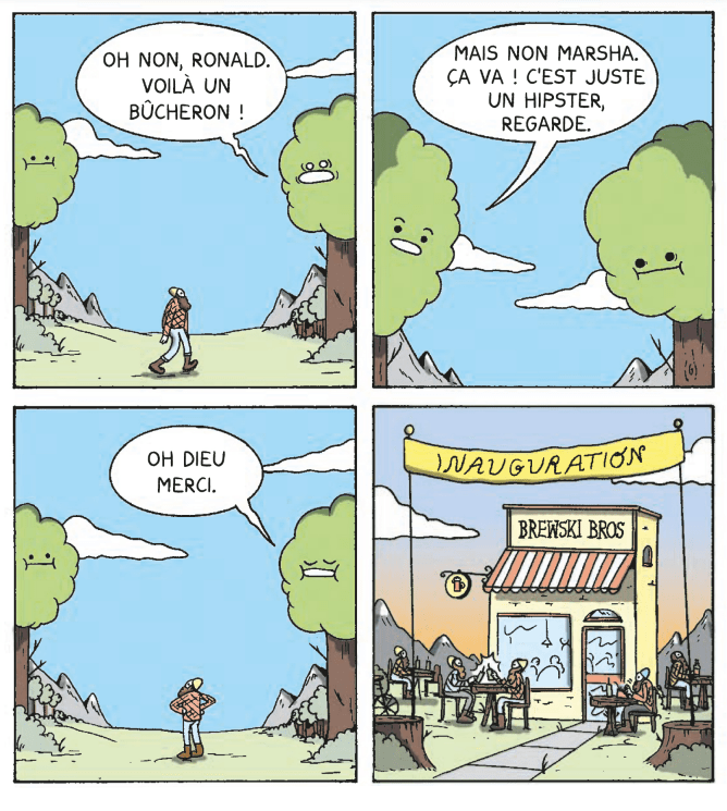 Le duo War and peas revient avec un album à ne pas piquer des hannetons. Il traite avec humour et cynisme d’écologie, de sexe, d’isolement social… Cela ne veut pas dire qu’il n’y a pas un brin de poésie et de positivisme. Une page va avec une blague en 4 ou 6 cases. Un exercice difficile qui montre que le talent des bédéastes. Il n’est pas donné à tout le monde de faire parler un soleil pervers, une mante religieuse qui veut devenir gay pour rester en vie ou une pâquerette obsédée sexuelle. Impossible de ne pas rire ou sourire à l’une de ces espiègles propositions. Au final, il est difficile de ne pas être sensibiliser à la cause environnementale. Rire du drame pourrait inciter certains à changer d’attitude. Tous les petits pas ont de la valeur. Donc à lire pour rire et partager avec son entourage. Un gag vous fera toujours pensé à quelqu’un et vous aurez envie de lui envoyer par sms. Une action qui ne se fait pas toujours.