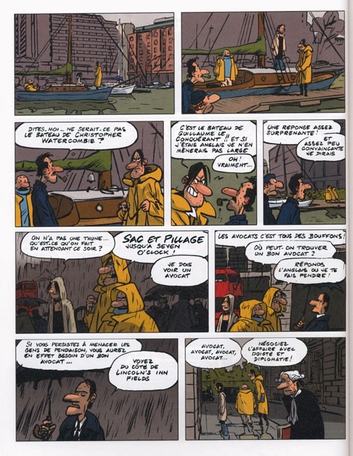 Damned, shocking et toutes ces sortes de choses ! Rien ne va plus : on envahit l’Angleterre ! À vrai dire, aucun rapport avec Guillaume le Conquérant : ici, les envahisseurs ne sont que deux. L’un est un grand échalas légèrement azimuté, qui se balade avec un dico à la main et se prend pour des personnages célèbres. L’autre s’appelle Louis le Vétilleux, « véritable et unique souverain de Jersey et Guernesey ». Il prétend être le propriétaire légitime de ces deux territoires en vertu d’un acte authentique du XIIe siècle – d’ailleurs, ceux qui ne le croient pas n’ont qu’à jeter un œil au document qu’il garde attaché autour de la taille, ils verront bien ! Et voilà ces deux doux dingues qui traversent la Manche à bord d’un chalutier, arraisonnent un bateau de plaisance en cours de route et font irruption chez un grand cabinet d’avocats, histoire de montrer de quel bois ils se chauffent. Et si on ne les croit pas, le Vétilleux se met à hurler « Haro, mon duc ! On me fait tort ! » On dirait Jacquouille dans Les Visiteurs, pour donner un ordre de comparaison… Pendant ce temps, le grand échalas se prend pour Margaret Thatcher, pour Tamerlan (ce qui fait de lui le héros d’un islamiste londonien qui n’hésitera pas à attaquer la reine à coups de bâtons de dynamite), pour Stanley et même pour Éric Cantona, ce qui en dit long sur la précarité de sa santé mentale…