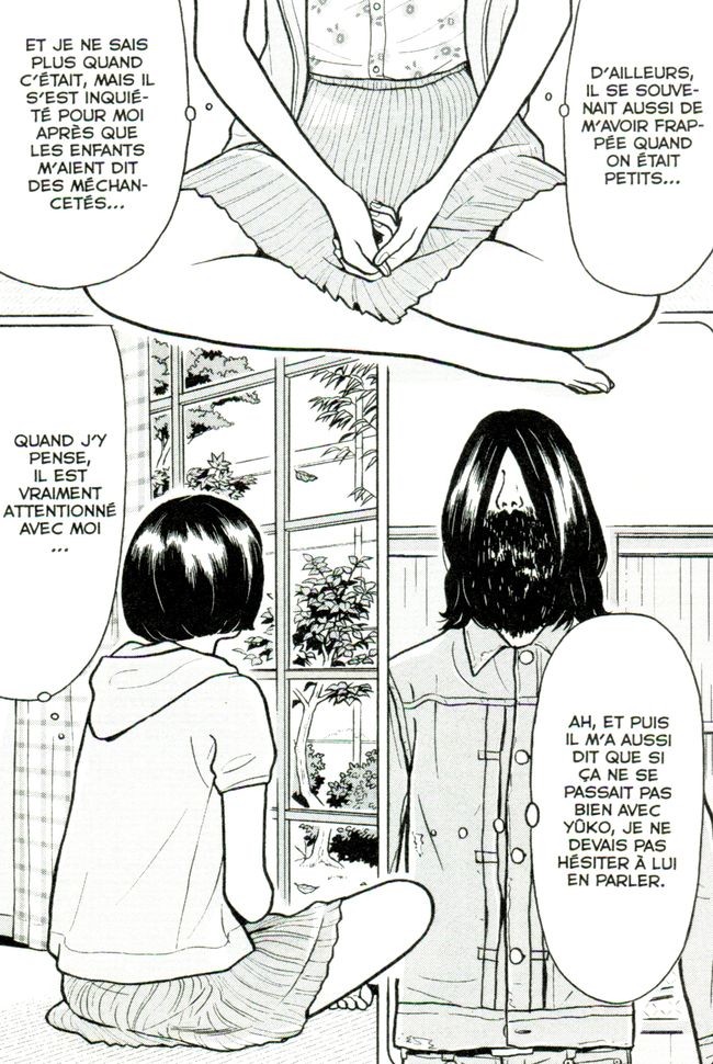 Quand un voyage se fait en perspective, les adultes doivent rester à la maison pour garder un des gamins malades. Il tente un rapprochement et l’autre l’envoie bouler. Puis après elle donne sa démission car l’adolescent à l’attitude perverse cherchait à lui dire son affection. Insupportable de la première à la dernière page. Shigeji arrive à la retrouver dans le cimetière de sa mère et lui déclare sa flamme, avec beaucoup de mesure et sans trop d’émotions non plus. Il lui propose de se marier de but en blanc. Elle pleure et reste dans le silence. Son cerveau mouline de tergiversations vaines et inutiles. On s’ennuie et ça énerve. Pourquoi avoir le contenu d’un manga pour adolescent dans un ouvrage pour adulte?