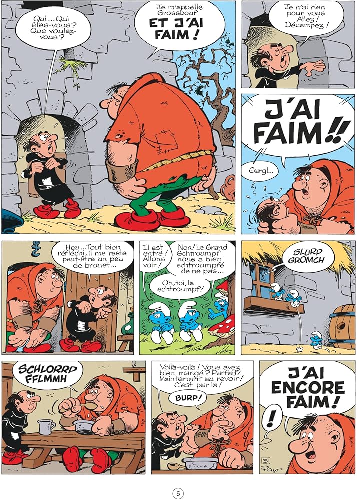 Un jour, l’ogre Grossbouf frappe à la porte de Gargamel, il a très faim. Après avoir fini tout ce qu’il a de consommable, il a encore faim. Gargamel lui parle d’une fameuse soupe aux schtroumpfs. Il les trouvera dans la forêt et il se sera délicieux. Bien entendu, il trouve le village et les choses ne tournent pas comme prévu. Le grand schtroumpf pendant qu’il prépare un mélange magique, les schtroumpfs le divertissent pendant ce temps. Quand l’ogre boit la soupe le voilà tout bleu. Il est furieux et souhaite faire la peau à Gargamel. Le comique de situation se fait par la suite quand il tente de trouve le remède pour que Grossbouf retrouve son apparence normal. Le regard d’adulte trouve cette histoire assez cruelle car le grand Schtroumpf manipule et humilie l’ogre. Il donne sans cesse des ordres. Puis que Peyo tient des propos grossophobe déjà avec le personnage principale grand, gros, débile et qui ne pense qu’à manger. C’est assez péjoratif et humiliant. Pourquoi après s’étonner que les enfants à l’école harcèlent leurs semblables quand la culture pop le légitime. Les limites de l’humour, surtout à destination des plus jeunes, est la discrimination. Le reste des gags en une ou plusieurs pages n’ont aucun intérêt car tout est prévisible et évident. Plus les lectures des schtroumpfs avancent et plus l’appréciation diminue.