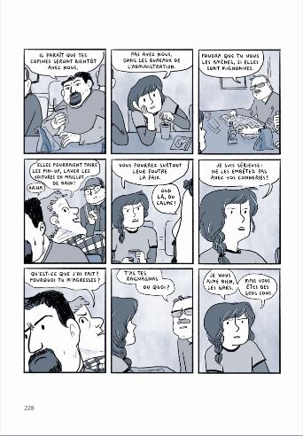 Il y a tout de même un autre aspect abordé. La Nouvelle-Ecosse a perdu toutes ces industries et donc il n’y a presque plus d’emplois. Les habitants partent du pays pour trouver un travail et rémunérateur. Donc même si tu as fait des études, tu pars dans ces usines d’exploitation pour rembourser tes prêts ou permettre à ta famille de survivre. En effet, ce monde dur et injuste change les gens. Les dirigeants font en sorte de faire des économies sur tout, même des gilets de sécurité. Tout le monde veut partir et change éventuellement de site. La bédéaste assume aussi sa passion pour le dessin et la bande dessinée. D’ailleurs, c’est devenu son travail lui permettant de retourner ces terres natales, chères à son coeur. Elle est bien arrivée à retranscrire l’ambiance grâce aux nuances de gris et le dessin très expressif.