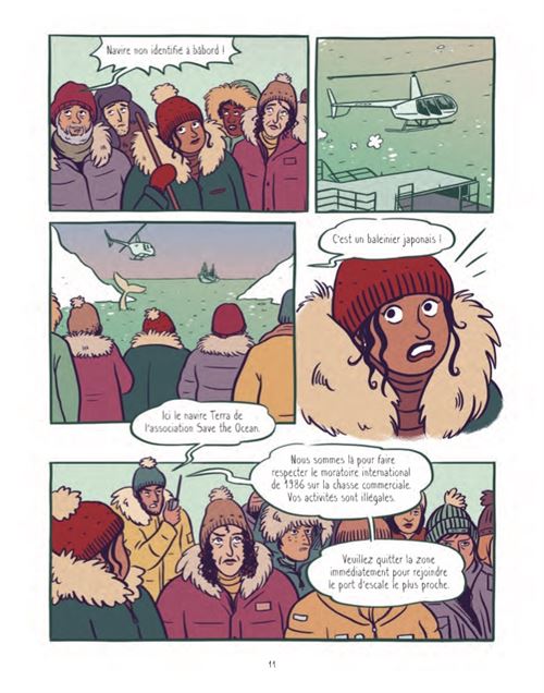 « Ce que les gens ne savent pas, c’est que les espèces protégées ne le sont qu’en théorie. La pêche illégale et le braconnage continuent en dépit des lois. 400 zones sont déclarées mortes, les grands prédateurs disparaissent! Leur extinction semble inévitable d’ici quelques années. Si on n’est pas capables de sauver les baleines, on ne sera pas capables de sauver le reste de l’océan et on disparaîtra avec lui. L’association Save the Ocean milite pour l’avenir de l’humanité. Les politiques laissent faire et ferment les yeux. Mais n’avons plus le temps! Nous pratiquons la lutte concrète sur le terrain, pour empêcher les massacres, avec des méthodes non violentes : ne blesser personne, ne pas enfreindre la loi. Si tu es prêt à risquer ta vie et ta liberté pour une baleine, viens nous rejoindre sur un bateau. Les paroles ne suffisent plus : il est temps d’agir! » (p. 65).