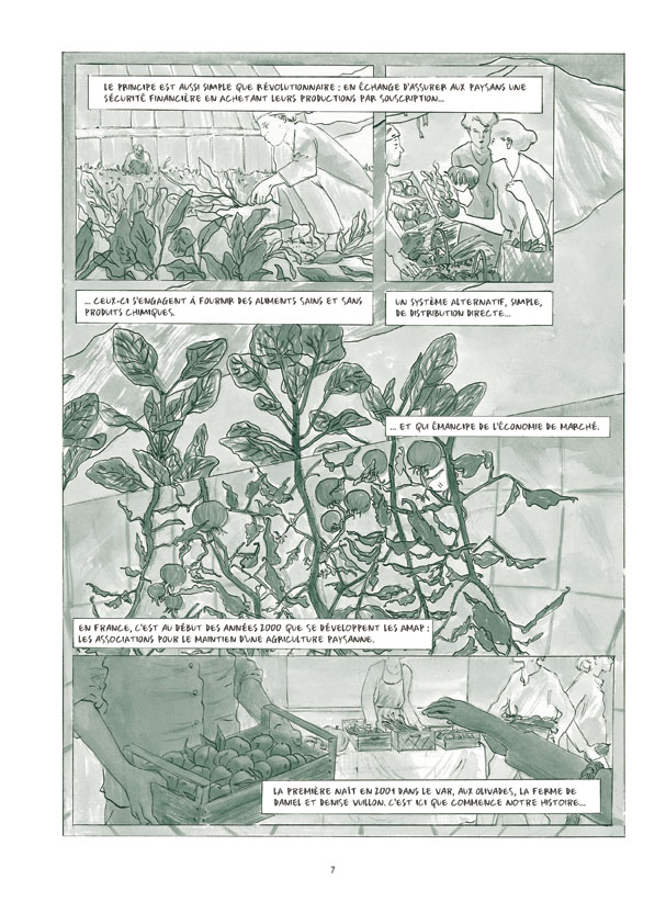 Le concept de circuit court est apparu au Japon dans les années 1960 sous le nom de Teikei (coopération) pour garantir une sécurité alimentaire menacée par la pollution industrielle. « Le principe est aussi simple que révolutionnaire : en échange d’assurer aux paysans une sécurité financière en achetant leurs productions, par souscription… Ceux-ci s’engagent à fournir sans et sans produits chimiques. Un système alternatif, simple, de distribution directe et qui émancipe de l’économie de marché. En France, c’est au début des années 2000 que se développent les AMAP : les associations pour le maintien d’une agriculture paysanne. La première naît en 2001 dans le Var, aux olivades, la ferme de Daniel et Denise Vuillon. C’est ici que commence notre histoire… » (p. 7). Le scénariste nous propose de suivre le cheminement de ces deux individus pour garder la passion de leur métier, une éthique dans le métier et enfin de quoi de vivre. Il propose de structurer par tranche d’années.