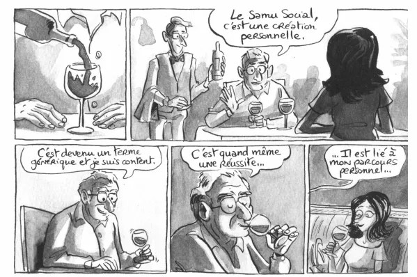 Tout débute le 10 juillet 2015 où Aude Massot contact le service de communication du Samu Social à Paris. « Je voudrais plutôt faire une sorte de documentaire en BD » (p. 9). Le 5 août 2015, elle rencontre pour la première fois Xavier Emmanuelli, un homme charismatique. « Le Samu Social, c’est une création personnelle. C’est devenu un terme générique et je suis content. C’est quand même une réussite. Il est lié à mon parcours professionnel… Je vais vous l’expliquer en trois mots pour que vous compreniez d’où ça vient. Quand j’ai commencé ma carrière, j’étais médecin d’urgence à la marine marchande. » (p. 16). Cela peut paraître un peu prétentieux cette façon de parler. Dans la préface, on présente l’homme ainsi « Xavier Emmanuelli agit dans les domaines de l’humanitaire (Médecins sans frontières), de la politique (secrétaire d’Etat chargé de l’Action humanitaire d’urgence) et de la santé (chef des Maison d’arrêt de Fleury Mérogis, chef du service qu’il crée Souffrance psychique et précarité dans les Hôpitaux de Saint Maurice…). Il fonde également des structures pour développer l’accompagnement médico-psychosocial des personnes en situation de rue (Samusocial de Paris Samusocial International) et des personnes âgées isolées (Les Transmetteurs). » (p. 4). Le parcours de l’homme force le respect.