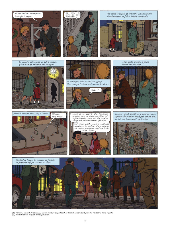 Ce qui étonne aussi est que l’on débute avec une préface expliquant le contexte des mines de charbon. C’est signé par Camille Rigebert et on ne sait pas son métier. Nous ignorons en quoi cette personne peut dresser un bilan. Quelle est sa légitimité? Elle propose un résumé de la politique d’extraction du charbon en France et en Belgique. Les conditions de travail difficile sont abordés. Cela servira de base pour le récit fictif. On retrouvera le fait que les profits valent plus que la vie des mineurs. Néanmoins, les scénaristes insistent plus sur le côté paternaliste du patron qui se soucie vraiment de ces employés. « Mon devoir est de penser avant tout à la vie de mes employés… D’autre part, je ne voudrais pas que l’on me reproche d’entraver l’action de la police. » (p. 9). Ou « – J’ai fait en sorte que la famille soit relogée dans une maison plus confortable. Mais, depuis, Luciana n’est plus la même et sa fille Laura a perdu la parole. J’ai pris en charge son traitement chez un psychiatre de ma connaissance. – Hum… Je vois que derrière l’administrateur se cache un homme de coeur… » (p. 33). Le problème vient d’un sabotage interne. Un choix qui détonne par rapport aux informations premières. On a juste une prise de conscience d’un subalterne qui choisit de minimiser les choses pour se faire bien voir. Donc ce n’est pas une faute directe des responsables du site. « Toute cette exploitation est vétuste, pourrie jusqu’à la moelle! Le rendement a toujours passé avant la sécurité! Et moi, j’ai toujours fermé des yeux, omettant de mentionner les incidents dans les rapports pour ne pas avoir d’ennuis, ni avec la direction, ni avec l’inspection des mines! Par exemple, cette huile qui a provoqué l’incendie, on aurait pu la remplacer par un liquide ininflammable ! Mais cela aurait entraîné un surcoût… » (p. 16).