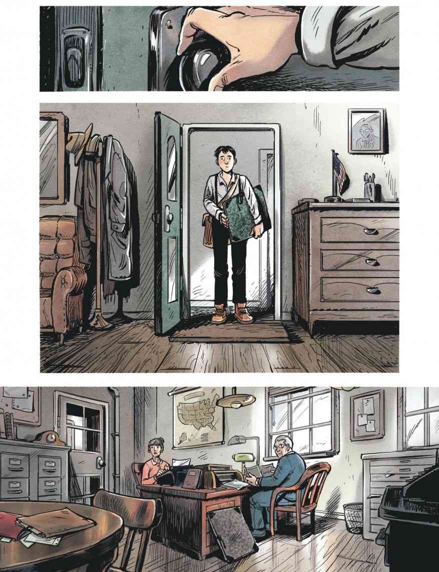Pour mieux découvrir ces paysans en souffrance, Aimée de Jongh invente John Clark, photoreporter de 22 ans. Il porte le même prénom et nom que son père, photographe, alcoolique et violent. Une identité très lourde à porter et dont il mettra du temps à se séparer. Pour sa commande, il trouve les images qu’on lui demande de prendre. Une approche qui le dérange car il doit mettre en scène certaine chose pour les rendre plus dramatique. A force d’être en contact avec la population, le drame suffit à lui même. Progressivement, le cadre imposé lui pèse. Quand la mort lui fait face, c’est le signe qu’il peut changer les choses. Il laisse tout derrière lui et prend un nouveau départ. Cette approche de la triche est abordée aussi. « En 1936, la FSA fait circuler auprès des journaux locaux une série de photos que Rothstein consacre à la sécheresse dans l’image d’un crâne de boeuf sur une étendue de terre craquelée. Mais la rédaction d’un de ces journaux, la Fargo Forum, découvre que le même crâne se retrouve sur d’autres photos de Rothstein, chaque fois dans un environnement différent, comme un accessoire de cinéma. On accuse alors la FSA de propagande, et de manipuler l’information dans son propre intérêt. Rothstein aura beau affirmer que son intention n’était pas de dramatiser la réalité, cette controverse jettera un voile sur le reste de sa carrière. » (p. 282). On apprend que même les célèbres photos de Dorothea Lange a placé les gens pour un rendu optimal de ses photos.