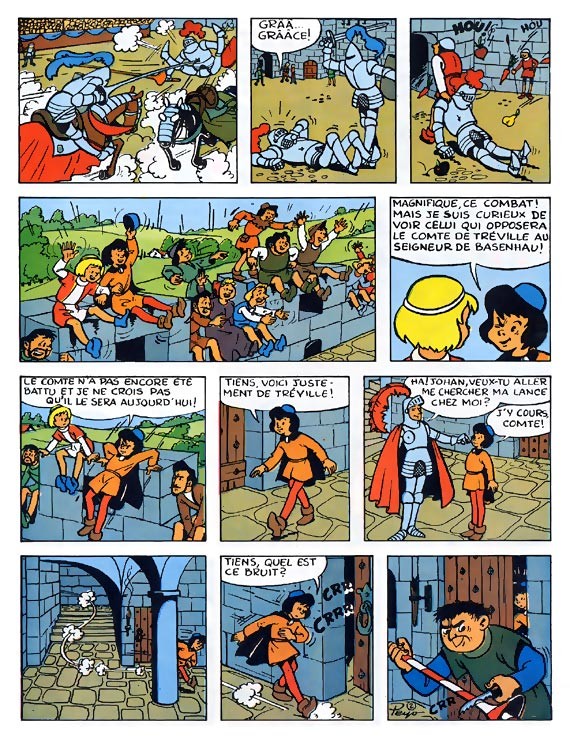 Parfois il est bon de faire un voyage dans le temps. Direction « Spirou » en 1954 pour rencontrer Johan. Pirlouit n’a pas encore été créé. Peyo, connu surtout pour les petits bonhommes bleu, s’est illustré dans un autre récit pour enfant. Johan est un brave garçon qui est toujours gentil et honnête. Quand il voit un gros vilain, il le dit et ce dernier est pris. Le roi continue son quotidien en ne faisant pas grand chose. Un gros pacha très naïf ayant des braves soldats qui le protégeront au péril de leur vie. Tout est très simplet dans une vision très binaire gentil et méchant. Johan dénonce les vilains et va même jusqu’à s’infiltrer. Le vrai héros l’aidera à s’en sortir. Les rebondissements sont assez grotesques et très léger. Aucune crédibilité n’est au rendez-vous. Si on remet dans le contexte de l’époque, on est dans l’audace aventureuse qui ne risque pas de perturber les gamins prépubères. On dénonce, on montre du doigt le coupable et on l’humilie. Les gros sont soit niais ou soit méchant. Et pas un poil à l’horizon. Un vrai mec est imberbe.On dénonce, on montre du doigt le coupable et on l’humilie. Une morale d’une autre époque qui espérons n’aura plus sa place dorénavant.