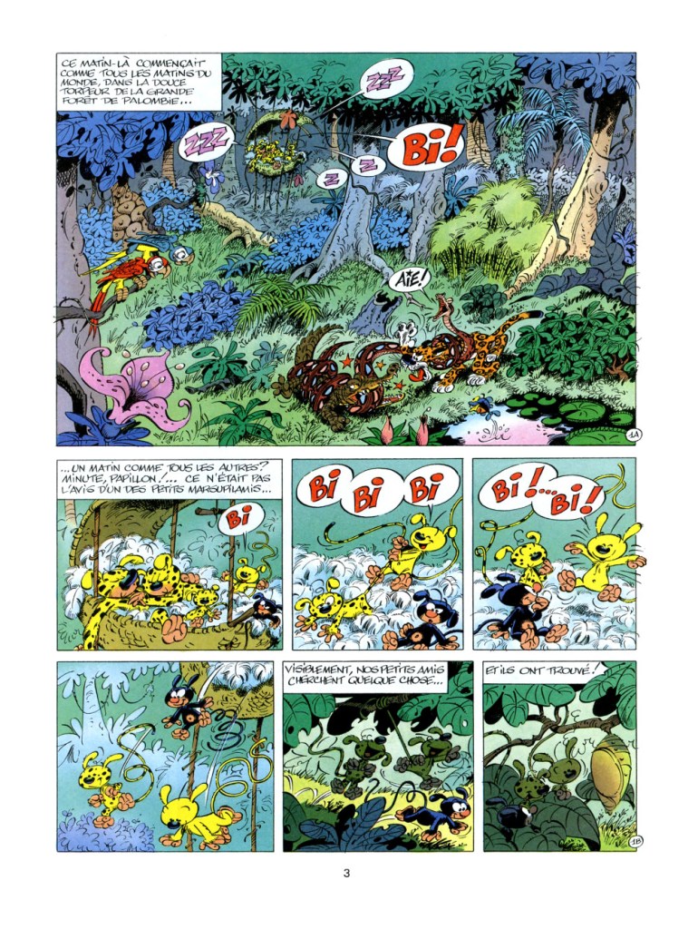 Direction la Palombie où vie le Marsupilami avec sa famille. Le méchant chasseur présente l’animal pour ceux qui ne le connaîtrait pas encore. « Ca s’appelle un marsupilami! Le prince de la forêt de Palombie! Agile comme un singe et fort comme un tigre! A côté de lui, le féroce jaguar ressemble à une peluche pour môme… » (p. 8). Il se passe des choses un peu étrange dans sa forêt. Des collectionneurs et des scientifiques viennent chambouler l’équilibre de la nature. Déjà avec des déchets de conserves, jeter en pleine forêt. D’ailleurs, le récit débute avec ces boîtes de métal jeter par les chercheurs. Une approche qui n’incite pas au respect et ce n’est pas vraiment amusant.