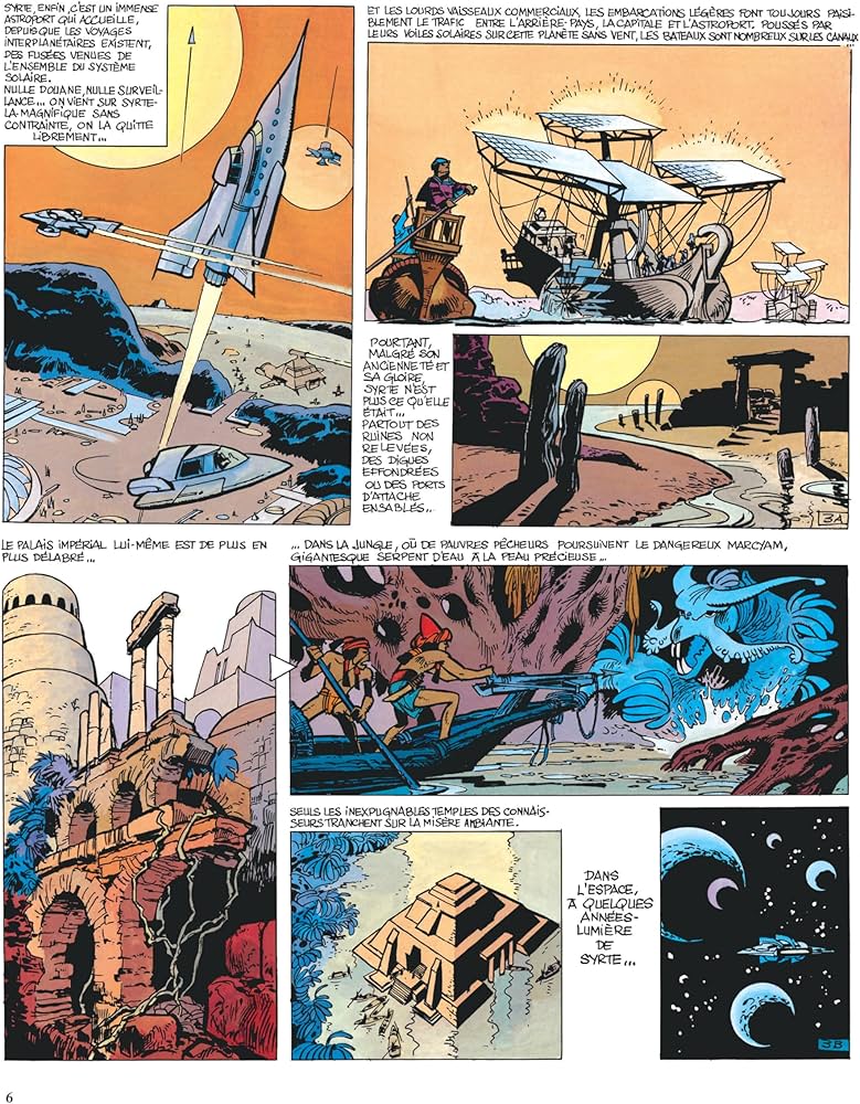 Partir en compagnie de Laureline et Valérian, c’est un vrai voyage dans le temps et dans l’histoire de la SFFF du 9e art. Les deux agents doivent vérifier que Syrte n’est pas dangereux ni maintenant ni dans le futur pour les terriens. C’est une société très moderne, ouverte, tolérante du moins, c’est l’impression qu’elle donne. « C’est un immense astroport qui accueille, depuis que les voyages interplanétaires existent, des fusées venues de l’ensemble du système solaire. Nulle douane, nulle surveillance… On vient sur Syrte la magnifique sans contrainte, on la quitte librement… Et les lourds vaisseaux commerciaux, les embarcations légères font toujours le trafic, entre l’arrière-pays, la capitale et l’astroport, poussés par leurs voiles solaires sur cette planète sans vent, les bateaux sont nombreux sur les canaux. Pourtant, malgré son ancienneté et sa gloire, Syrte n’est plus ce qu’elle était… Partout des ruines non relevées, des digues effondrées ou des ports d’attache ensablés… » (p. 6). Le cadre est posé.
