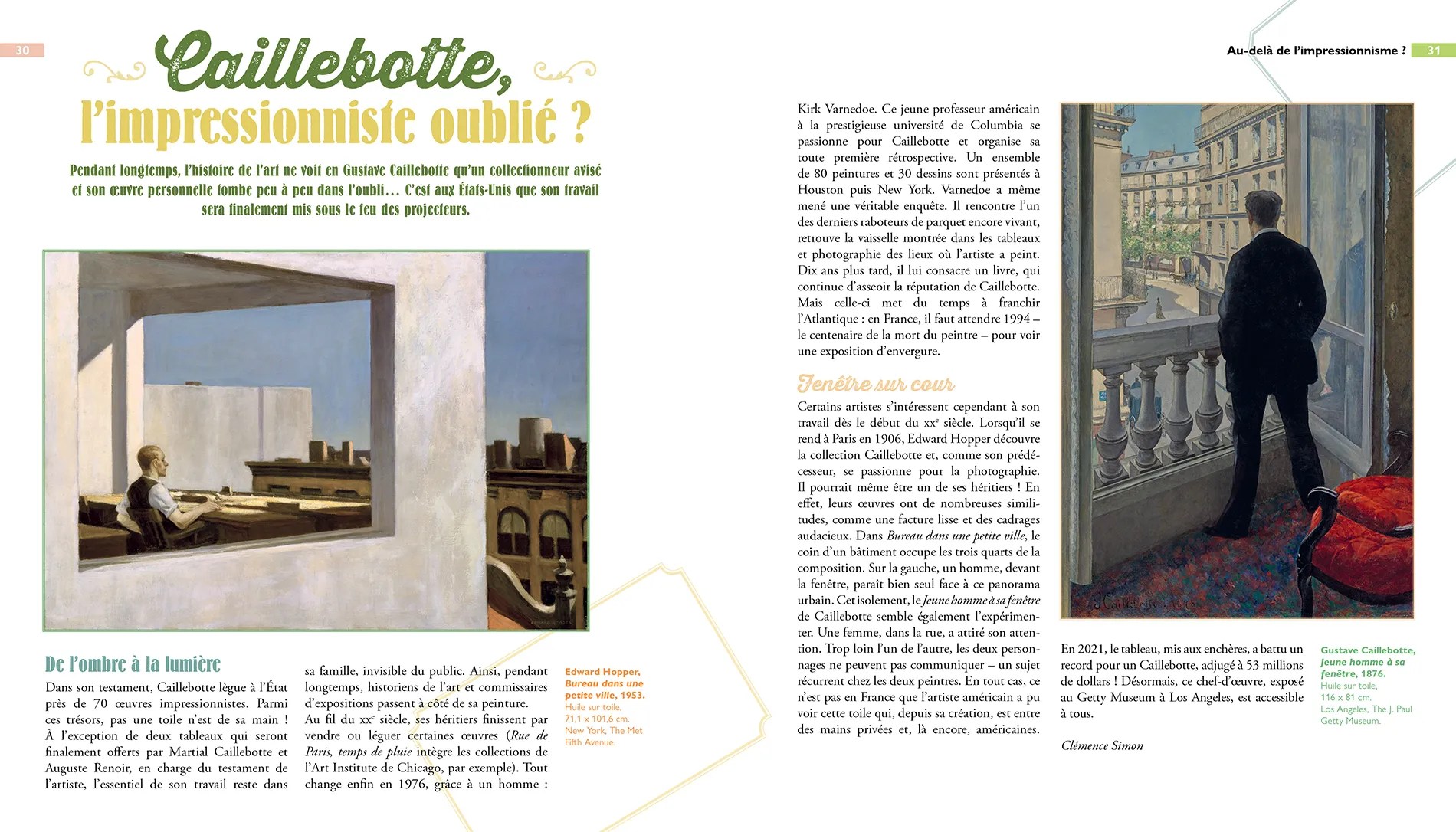 Les premières double pages donnent des informations sur M. Caillebotte, le renouveau de Paris avec le préfet Haussmann, le mouvement des impressionnistes et l’atelier de l’artiste. Il met en avant la modernité de la ville, le changement de classe sociale avec plus de bourgeois, l’influence des estampes japonaises… Un travail très riche avec une grande maîtrise technique. La qualité de l’oeuvre en reproduction est fidèle au rendu quand on le voit. Le plus que propose le magazine repose sur des expérimentations artistiques avec un travail d’imagination et de reproduction. Une façon très ingénieuse d’inciter à voir autrement en se l’appropriant. Impossible de fermer le magazine sans l’envie de voir en vraie des peintures de Caillebotte et de créer.