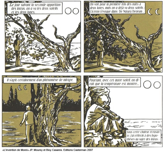 Il est très audacieux d’adapter en bande dessinée le livre « L’invention de Morel ». Adolfo Bioy Casares, auteur argentin propose un roman assez étrange. Pour mieux comprendre aussi bien la démarche que le récit, nous avons le droit à une préface et à une post-face qui s’avère très utile. Ce sentiment de bizarrerie se retraduit parfaitement dans l’ouvrage. Jean-Pierre Mourey possède un style graphique réaliste avec un trait assez épais et très abrupt. Il modifie les teintes pour montrer des transitions de moments. N’oublions pas que le récit se fait autour d’un homme qui fuit son pays. Des personnes lui indiquent un lieu où il serait protégé de tout risque. Étonnamment, un jour, des estivants débarquent. Parmi eux, il y a Faustine et il tombe littéralement sous son charme. Il n’ose pas s’approcher d’elle. Un jour, il découvre ce qui se passe sur l’île isolée du monde. Morel a inventé une machine qui capte les gens pendant un moment et les rend immortels à travers les projections des scènes dans l’espace encore et encore. « Alors il a tramé la semaine éternelle, il a tué Faustine et tous les autres. Il s’est rué, inventant l’immortalité! » (p. 97). Alors l’homme s’approche de Faustine et invente des discussions avec son image. A défaut de pouvoir un jour la rencontrer, elle est à lui pour toujours. Il se dégage quelque chose entre la poésie, le rêve et la folie. De ce fait, on est à la fois curieux et mal à l’aise. La position du voyeur et du regardant a aussi de quelque chose de dérangeant. La répétition des scènes encore et encore lasse car tout semble évident. On évoque une épidémie forte pour que personne ne vienne sur l’île et découvre l’expérience macabre. Un prétexte idéal où la mémoire active garde des souvenirs de maladie et de mort. L’envie de se plonger dans le roman est absente car on a la certitude que l’adaptation reste fidèle.