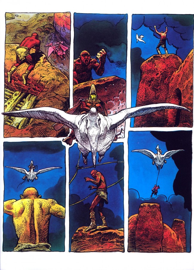 Des récits sans bulles, un schéma narratif novateur, des graphismes qui fourmillent de détails, Arzach est un album phare : il est celui où Giraud devient Mœbius, laissant de côté les dessins réalistes de Blueberry pour explorer « le niveau le plus profond de la conscience, à la frange de l’inconscient». Un chef d’œuvre.