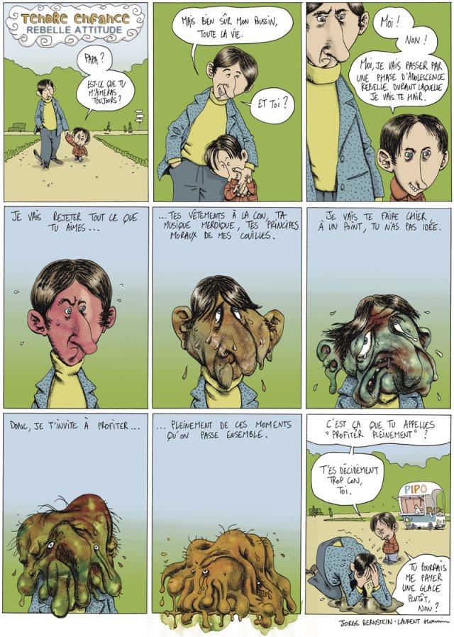 Véritable critique de la société, Tendre enfance est une BD à l’humour noir grinçant où les enfants reproduisent les schémas parentaux tout en se jouant d’eux. Cruels, (pas si) bêtes et méchants, ils usent du chantage pour parvenir à leurs fins, obtenir de l’argent de poche ou de l’affection. Ils achèvent leurs géniteurs sans pitié. Mais les grands ne sont pas que des victimes, les bambins ont de qui tenir ! La BD allie l’humour ciselé de Jorge Bernstein aux dessins souples, dynamiques et trash de Laurent Houssin. Après L’Humour Légendaire et Kåtalög, Jorge Bernstein est également auteur de l’absurde CONversations, illustré par Fabcaro, tous publiés chez Rouquemoute. Outre ses collaborations avec les revues Carabistouille, Jade ou AAARG, ses illustrations jeunesse, ses pochettes pour Marcel et son orchestre et son travail sur la série Loana et ses amis pour Grolandsat / Canal+ et Moi Benzo (Sélection officielle Annecy 2002), Laurent Houssin a publié La vie en rouge avec Lindingre en septembre 2018 chez Fluide Glacial.