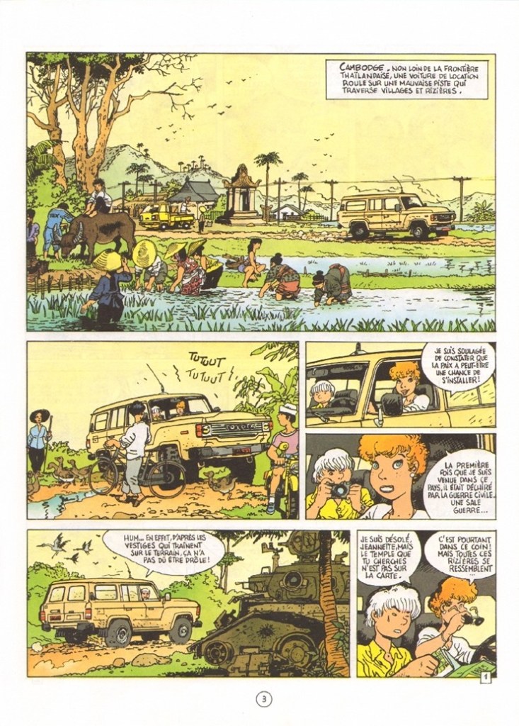 Le réel objectif est la recherche de Ya Ho, jeune réfugié d’un camp de Médecins sans frontières établi près de la Thaïlande. Elle l’a déjà rencontré lors d’un précédent reportage et doit le retrouver. De plus, sa petite soeur est sa seule famille. Elle n’a plus parlé depuis leur séparation. Bien entendu, nous assisterons à un happy end où tout finit bien pour tout le monde. Marc Wasterlain en profite pour évoquer des sujets sensibles sans trop insister avec la guerre civile, les réfugiés, les armes à feu, le trafic de drogues, les mines antipersonnels, les organisations religieuses, les sectes… Le titre est orientée vers les femmes girafes. Là aussi, le bédéaste n’approfondie ni l’approche culturelle ni sociale. Elles restent juste des éléments de décors originaux. En effet, sur la couverture, leur présence détonne. Dans le récit, elles prennent les armes car leurs hommes ont été enlevés. A part avoir du caractère, on ignore tout d’elle. Encore une fois, tout va vite, semble fluide et avec peu de contenu concret derrière. C’est la marque de fabrique de la série. Les gentils blancs apportent toujours la paix, une pensée que l’on trouve trop souvent à cette époque. Tuer, exploiter ou blesser gravement des animaux n’est pas gênant si cela les arrange. L’ethnocentrisme est vraiment déplacé dans ce contexte.