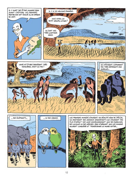 Quand on voit l’épaisseur de « Sapiens » de Yuval Noah Harari, on peut appréhender de se plonger dans son ouvrage. Raconter l’Histoire de l’humanité de façon complexe et critique ne peut pas se faire en trente pages. Le projet est pharamineux. Il y a un constat aussi bien du côté des experts que des néophytes sur l’accessibilité, la véracité et la richesse des informations donnée. La vulgarisation est très bien réalisée et le succès des ventes le prouve. Donc, quoi de plus normal que l’on souhaite l’adapter en bd. Le duo que forme David Vandermeulen et Daniel Casenave a l’habitude de cette exercice. On leur attribut l’histoire du vin, Hubert Reeves nous explique, la Petite bédéthèque des savoirs, l’Histoire dessinée de la France… Un dessin clair qui va à l’essentiel, des couleurs assez ternes pour éviter que notre regard s’arrête sur des détails inutiles et des personnes assez humaines.