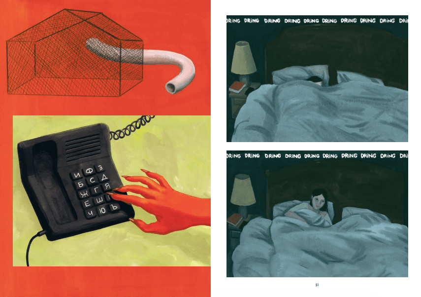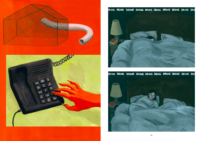 Progressivement l’album vire au thriller psychologique. Lena reçoit des appels de sa mère morte. Comment est-ce possible? Elle cherche à comprendre comment est-ce possible. Car même lorsqu’elle couple les câbles, le téléphone sonne. Qui cela peut être? Son compagnon lui demande de rentrer car il a besoin d’elle à ces côtés. Au final, de quoi, elle a besoin? Les choses deviennent de plus en plus étrange avec cet étrange crabe venant d’un coquillage. Il coupe le fil du chargeur du téléphone portable et tente de couper un doigt de Lena. Une angoisse glaçante s’installe et s’oppose à la chaleur des couleurs. Bien que parfois, on a de l’obscurité qui se faufile qui tranche avec du rouge. Tout s’oppose et génère un trouble. Il n’y a pas de fin et c’est au lecteur d’aller plus loin dans son imaginaire ou non. Une lecture qui ne nous laisse pas insensible.