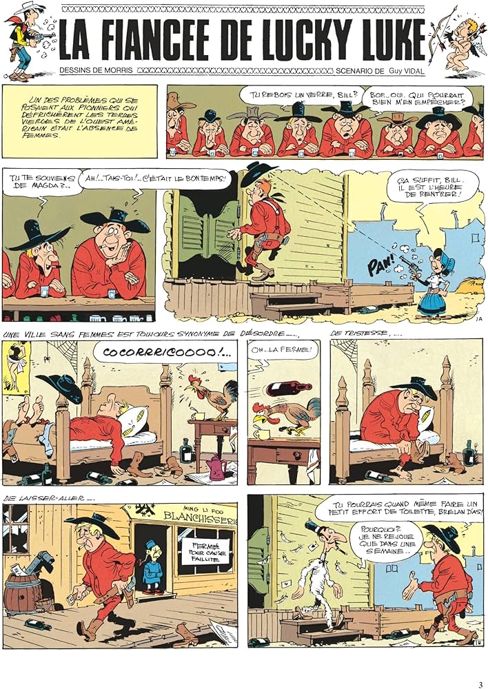 Une légère appréhension se fait en amont quand on regarde la couverture. Impossible que Lucky Luke puisse tomber amoureux d’une femme car cela serait contre nature. Par conséquent, c’est un album pour se moquer de la futilité des femmes. Guy Vidal trouve tous les registres possible pour se moquer de ces dames célibataires en quête d’époux. « Si nous prenons pour base les quinze couples en question et si nous admettons que chacun de ces couples peut s’attendre à engendrer une moyenne de deux ou trois enfants, votre attitude vous rend responsable de non-assistance à un nombre effroyable de personnes en danger d’inexistence! » (p. 7). En effet, il aurait pu dénoncer le fait que sans mari, ces demoiselles restent sans statut et dépende d’un homme. Sinon, elles sont considérées comme des enfants. Ce n’est pas très drôle. Même constat sur leur apparence physique, pour faire partie d’un groupe social il faut adopter les codes, sinon c’est le rejet. Là encore, il n’y a rien d’amusant. Car porter des corsets et des crinolines, n’est en rien agréable et confortable. Les quelques chiffres que l’on a prouve les soucis de santé. Donc prendre ces dames pour des femmes stupides et superficielles, c’est facile et c’est cultivé des clichés d’un autre temps. En plus, à cela se rajouter des stéréotypes physique avec l’irlandaise rousse et une cuisine peu appétissant, une asiatique petite avec un gros accent…