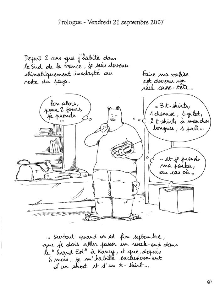 Un ouvrage qui permet de mieux connaître James. L’artiste a de nombreuses flèches à son arc. Ses créations ont des styles graphiques et des univers très différents. Pour cette échappée à Nancy, il conserve sa représentation anthropomorphique. Il est un ours comme à son habitude. L’enthousiasme n’est pas là car quitter Toulouse et sa chaleur demande un effort. En plus, il a peur d’un grand froid. De son week-end, on lui fait la commande d’en faire un ouvrage, celui qu’on lit. Il ne se passe pas grand chose et on sent la difficulté de l’exercice. Que raconter sur deux jours pour un salon du livre très standard? Il évoque ce dont il aime parlé, avec les collectionneurs, les bédéastes très célèbres, les comportements de certains fans… Et il y a des choses plus ordinaires comme des enfants qui se perdent et les bitures entre potes qui se retrouvent. Une vision que l’on ne connaît pas forcément. C’est léger et ça change les idées. Toutefois, rien de très mémorable.