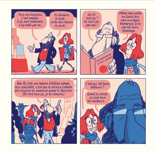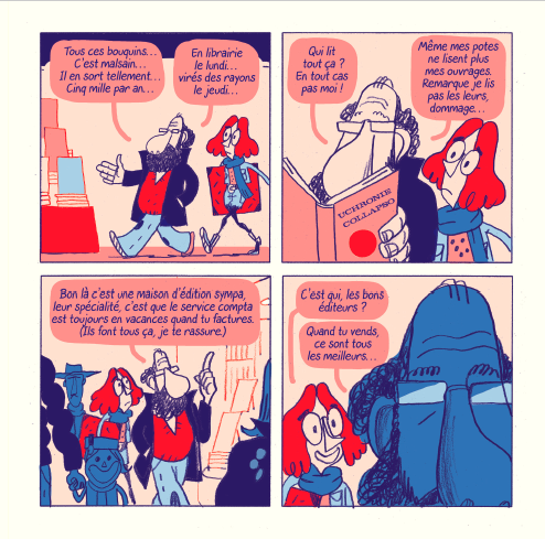 Hervé Bourhis possède un vrai sens de la dérision. Son amour de la bande dessinée n’est plus à démontrer. Dans son album, il se fait très plaisir pour jouer avec l’absurde, l’improbable et de la dérision. Le monde du 9e art, il connaît bien et peut s’en moquer librement. A l’image de son compère, James, ils décrivent un monde où la précarité se mêlent à quelques uns qui réussissent. La présence à des festivals où ils se croisent et se mentent sur leur réussite. Le dépit est de mise. Raymond Bouloche porte le poids lourd de l’échec et de la déprime. Année après année, les choses ne changent guère à part prendre de l’âge et se faire moquer. D’autres plus jeune arrivent comme Pétra avec des rêves plein la tête. La rupture entre les deux est bien net ce qui permet de créer des moments d’humour singulier. A cela se rajoute, les retrouvailles de vieux potes pour écrire un scénario de série populaire. Raymond n’arrive pas à trouver sa place. Rita rencontre le succès grâce à un partie pris. Même si le bédéaste affirme que ce n’est pas autobiographique, aucun doute qu’il y a bien plus d’une situation qui semblent véridique. Le choix de format, de couleurs, du dessin insufflent du dynamisme et un côté décalé ainsi qu’irréaliste. Il joue avec le dessin et l’introduction de photo ou d’image. Rien de tel pour flouter la limite entre réalité et fiction. On passe un bon moment atypique et qui casse la magie du monde de la bulle.