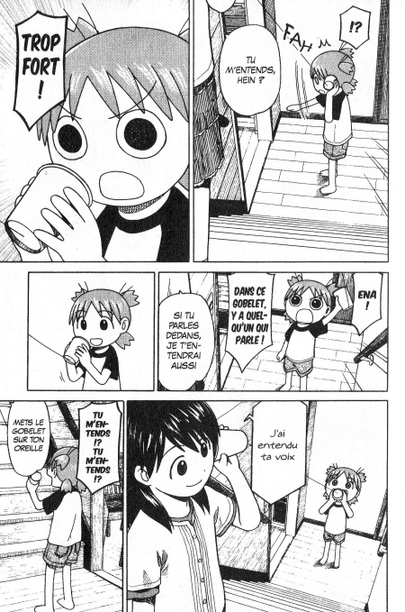 On retrouve Yotsuba toujours égale à elle-même. La gamine de 5 ans découvre le monde et s’émerveille de tout. Par conséquent, tout le monde doit se plier à ses exigences. Son père trouve cela tout à fait normal. Elle s’invite chez les voisines et découvre le téléphone avec des pots de yaourts et comment on fait un gâteau. Les grands rebondissements se font principalement dans la visite d’une ferme. Elle voit en vrai des moutons, des chèvres et des vaches. Pour donner un peu de peps, Kiyohiko Azuma, introduit un personnage qui fait polémique. Yanda ne ménage jamais l’enfant au prétexte de son âge. Ainsi ils se provoquent mutuellement amenant à des rapports improbables. Il faut dire qu’il faut une patience infinie pour garder son calme. Quand elle fait des courses pour le repas toute seule, elle ne prend que des choses pour elle avec des nouilles et du chocolat ou si elle a peur, elle frappe les animaux. Jamais, elle ne se fait disputer. On ne lui explique jamais que certains choses sont mals ou autres actions pédagogiques. Cela aurait été l’occasion de lui expliquer qu’est-ce que le lait, comment il devient consommable, on le transforme jusqu’à la consommation de l’animal. Espérons qu’elle va finir par grandir et faire plus attentions aux autres.