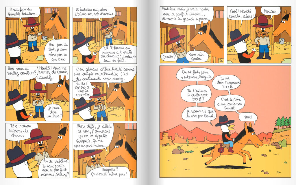 Quand on sait qu’Anouk Ricard a gagné le grand prix d’Angoulême, on sait pourquoi. La dame possède un sacré coup de crayon, une bonne gestion des couleurs et surtout une imaginaire débordante. Sous des faux airs de dessins pour enfants, se cache un récit incroyablement loufoque et atypique. Rien qu’avec la couverture avec une fausse explosion sur la page de couverture. Sans omettre la couleur jaune éclatante qui nous surprend l’oeil. La promesse est tenue. On passe un moment où l’on est sans cesse prie au dépourvu. Comment prévoir ce qui peut se passer entre un Ducky assez maladroit et Guiguite, le cheval qui marche aussi sur deux pattes. Impossible de ne pas être sous le charme de cette aventure étonnante. Elle utilise tous les codes pour mieux les détourner et s’amuser avec des animaux humanisés. Tout se déroule dans le désert et on peut rencontrer des choses tellement impressionnantes. Enfin des bédéastes qui osent mettre un bon de pied dans les classiques du western trop « syndrome du sauveur », misogyne et parfois à tendance raciste. Ici, on respire, on rigole et on s’amuse. Par conséquent, on souhaite suivre le travail d’Anouk Ricard.
