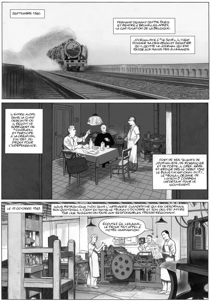 Le choix de structuration de l’album est très ingénieuse. Le dessin, les couleurs et le choix de police changent si l’on est dans les années 40 ou si l’on est à notre époque. Les deux se combinent à merveille au fur et à mesure de l’enquête. Dorénavant, ce moment est presque oublié. Il fallait le remettre dans les mémoires et l’inscrire dans un support. Le fait d’en faire une bande dessinée permet de l’inscrire dans l’Histoire et de la rendre accessible à tous. L’autre élément très important est la mise à disposition de cet exemplaire de « Le Soir » devenu très rare. Ainsi on peut se rendre compte de l’exercice et la force des mots. Une bande dessinée qui pousse à réfléchir à l’importance de chacun dans une société qui bascule du côté obscur. La loi peut se braver et il faut en accepter les conséquences.