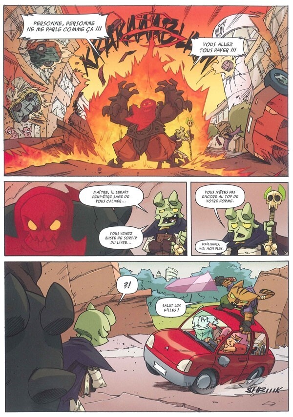 Tous les codes de l’épopée de la fantaisie sont respectés. Par contre, il y a un petit coup de jeune dans les personnages, leur dynamique et leur représentation. On ne voit pas de femmes à moitié nue pour exciter ces lecteurs en mal d’hormones. Bien qu’elle possède une taille fine, un haut rouge donc pas discret et une grosse poitrine à moitié apparente. Et elles ne servent pas uniquement de faire valoir. Le chat et l’adolescente forment un duo haut de gamme et que tout oppose. Rien de tel pour impulser des moments de dispute. Pas le temps de s’ennuyer. La série est très bien rythmée avec des périodes d’accalmie. L’humour est omniprésent et sous différente forme. Il y a des niveaux de langue, les formes d’expression avec du sarcasme par exemple. et des situations improbables. Par exemple, le méchant convoque des zombies. Comme il n’est pas très fort, peu émerge du sol. Les combattre devient plus facile et on assiste à des scènes de combat où la maîtrise des armes est au rendez-vous.